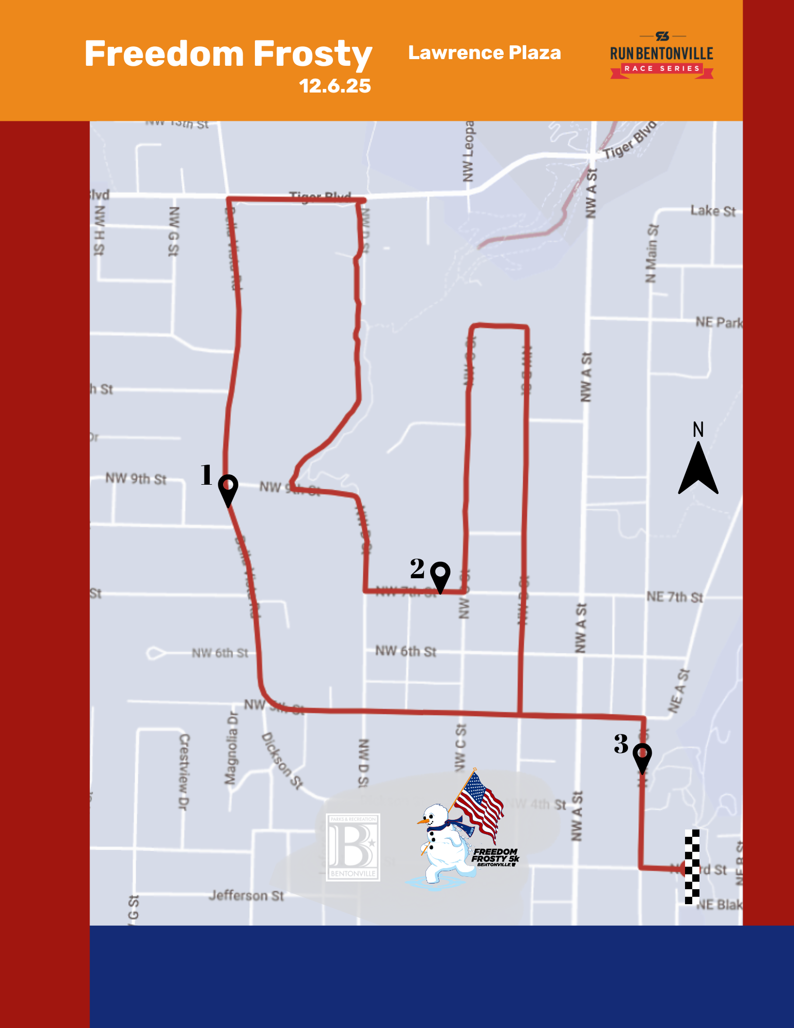 The race begins at 8:00am. Please allow yourself enough time to park and get to the starting area just North of the Downtown Bentonville Square. There is a variety of free public parking lots in the Downtown Bentonville area that are easily accessible to the Square.